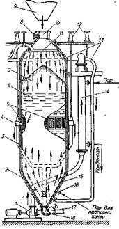 Варочный котел представляет собой цилиндрический сосуд, переходящий с обеих сторон в конусообразное сужение, заканчивающееся вверху загрузочной горловиной диаметром 800 мм, внизу — выгрузочной диаметром 700 мм. Диаметр цилиндрической части котлов 3600—4500 мм, общая высота 13 300—16900 мм. Котлы отличаются вместимостью и системами принудительной циркуляции. На рис. 7 показан котел, оборудованный системой Шауфельбергера— Эско. Штуцера для забора щелоков располагают в середине цилиндрической части,где, во избежание попадания во всасывающие трубопроводы щепы, устанавливают пояс сит с отверстиями 6—9 мм. Обратно в котел щелок подают в верхнюю и нижнюю конусные части. Циркуляционный насос должен обеспечивать 9—15-кратный обмен щелока в котле за время заварки, или 1/10 объема котла в ми-НУТ У- Для эффективного нагрева щелоков, необходимо, чтобы на 1 м3 объема котла приходилось 0,9—1,4 м2 греющей поверхности подогревателя.