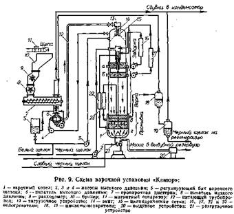 В современных целлюлозных заводах бойлер для регенерации химических растворов является наиболее дорогостоящим аппаратом. Черный отработанный варочный раствор и коричневый раствор, получаемый при промывке бумажной массы, в бойлере подвергают упариванию до получения содержания твердых веществ 55— 65 %, а затем распыляют и сжигают. В результате выделяется тепло и получаются химические соединения, входившие в состав растворов.
