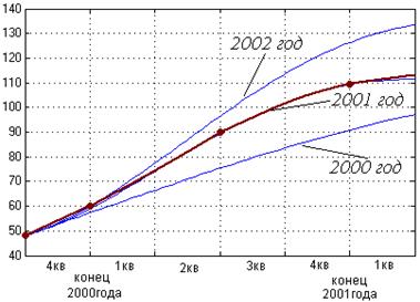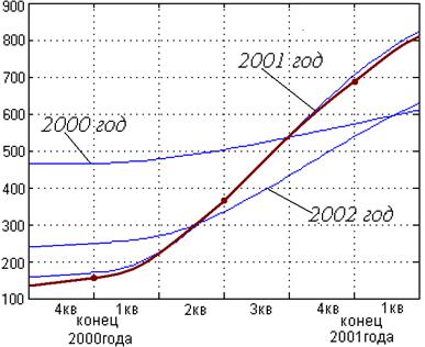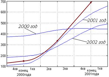 При моделировании услуги на несколько лет вперед нам нужно знать данные за первый год. В качестве промежуточного отрезка на начальном этапе рассматривался 4кв 2000 года, потом конец 2001г и конец 2002года. Результаты моделирования представлены на рисунках слайда 3. Из рисунков хорошо видно, что теоретическая и экспериментальная кривые практически совпали на среднесрочном отрезке – конец 2001 года. Это свидетельствует о том, что оценка коэффициентов была произведена, верно и данная модель для монопольной услуги ISDN работает в полной мере.