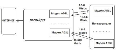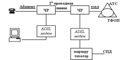 ADSL в первую очередь предназначены для скоростного доступа в Интернет, когда трафик из сети к абоненту гораздо больше, чем обратный, который содержит только запросы. Для технологий ADSL необходимо применение линейных кодов, в спектре которых отсутствуют низкочастотные спектральные составляющие. При этом телефонный сигнал, спектр которого находится в области низких частот, не создает помех сигналу передачи данных. Разделение этих сигналов у абонента и на узле сети реализуется с помощью частотных разветвителей - ЧР, называемых также сплиттерами. На данном рисунке ТФОП – это телефонная сеть общего пользования, АТС – автоматизированная телефонная станция.