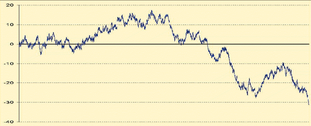 Специалисты, имеющие соответствующее образование обычно засаживались на несколько дней, пытаясь сделать настоящий, правильный генератор. Улучшение качества генератора в этих картинках не изменяет ничего. И мало того, легко показать, что характеристики идеальных случайных блужданий вполне соответствуют тем графикам, которые мы видим. С точки зрения трейдера в первую очередь, это впечатление их трендовости. Психологически мы ожидаем, что случайное блуждание должно все-таки как-то колебаться вокруг нуля. С какими-то отклонениями, уходами, но количество пересечений нулевой оси должно быть значительно больше. Мало того, в 70-е годы, когда все это описывалось у Феллера, был произведен опрос людей, занимающихся математической статистикой - какое количество в среднем пересечений с нулевой осью они ожидают. Результат опроса на порядок отличался от теоретического. В среднем, в 10 раз больше мы ожидаем пересечение с нулевой осью, т.е. намного менее трендовые графики.
