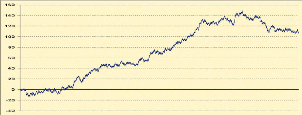 Необходимо просто более объективно воспринимать то, что мы видим в поведении цен и в результатах, которые мы получаем. Приведу пример. Многоуважаемый мною Джон Мерфи, автор наверное лучших книг по техническому анализу в главе, где он дискутирует с приверженцами теории случайных блужданий рынка, коим я ни в коей мере не являюсь, приводит график швейцарского франка за1985 год: