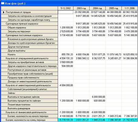 Потребность в капитале определяется на основании данных, отображаемых в Плане денежных потоков (Cash-Flow). Значения сальдо счета предприятия представлены в последней строке таблицы Cash-Flow и демонстрируют прогнозируемое состояние расчетного счета предприятия, реализующего проект в различные периоды времени. Отрицательное значение сальдо расчетного счета означает, что предприятие не располагает необходимой суммой капитала.