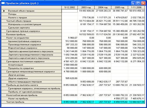 Общие издержки. Таблица отражает выплаты по каждому виду расходов, указанных в диалоге "Общие издержки" раздела "Операционный план". Итоговая строка этой таблицы детализации совпадает со строкой "Общие издержки" таблицы "Кэш-фло", если установлен стандартный порядок учета издержек в диалоге "Налоги/Учет" . Если общие издержки отнесены на другие статьи затрат, то они не показываются в этой строке "Кэш-фло"