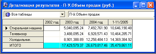 Диалог "Детализация результатов" открывает доступ к просмотру таблиц, содержащих подробную информацию о различных сторонах финансово-хозяйственной деятельности предприятия.