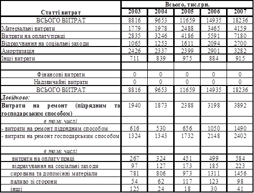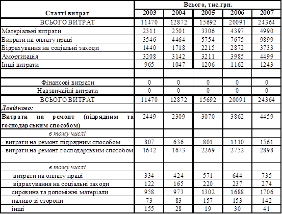 Таблиця 1Витрати по статтям собівартості у тому числі на ремонт (за рік 2003-2007 рр.)