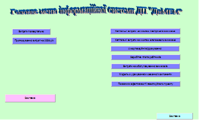 Елементи інформаційної системи були об’єднані між собою за допомогою інтерфейсу користувача, який забезпечує швидкий перегляд вихідних, проміжних даних та результату та містить у собі заставку, основне меню та основні, розроблені на робочих листах, підсистеми інформаційної таблиці у вигляді графіків та таблиць.