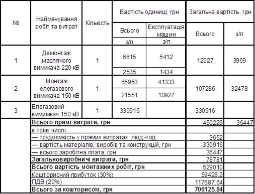 Таблиця 4 Капітальні витрати на монтаж повітряного вимикача
