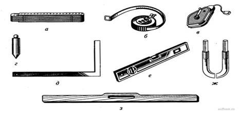 Рисунок 2. Інструменти для вимірювання та перевірки обробляємих поверхонь: а - метр складний; б - рулетка; в - Розмічальний шнур; г - висок; д - кутник; е - будівельний рівень; ж - водяний рівень; ж - рейка-правило.