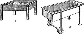 Для змочування поверхні водою перед штукатуренням користуються рогожною або маховою щіткою (рис. 2.5, а, б), а для зберігання і переміщення розчину на робочому місці - металевими або дерев'яними ящиками (рис. 2.6, а) і відрами. Для зручності в роботі штукатурні ящики можуть бути на колесах чи котках (рис. 2.6, б).