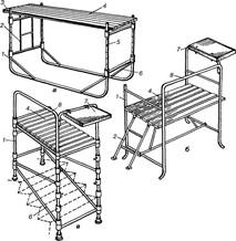 Пересувний різновисотний столик (рис. 3.1, а) складається з чотиристоякового опорного каркаса, драбини і дерев'яного настилу. Конструкція столика передбачає можливість піднімання настилу завдяки висувним стоякам, які переміщують уздовж нерухомих стояків і закріплюють штирями або спеціальними затискними гвинтами на потрібній висоті (від 0,7 до 1,7-2,5 м). За настил використовують інвентарний дерев'яний щит розміром від 60x120 до 80x160 см. Якщо настил столика необхідно підняти на висоту більшу за 1,1 м, його з одного боку обгороджують захисним поручнем.