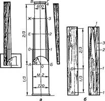 Профільну дошку роблять так, щоб на кінцях було не по цілій канелюрі, а менше половини її ширини (рис. 5.4, б). Розмір шаблону роблять з урахуванням того, що правила мають бути навішені у центрах канелюр, профільною дошкою по її краях витя гують ремінці - середину канелюр вручну легше обробити, ніж ремінці. Чим більше захваток, тим кругліша колона.
