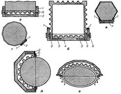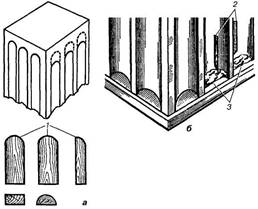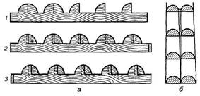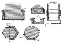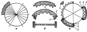 Потрібно мати на увазі, що при витягуванні канелюр на колонах, звичайно, навішують не менше шести правил. Для цього коло колони внизу і зверху поділяють на відповідну кількість однакових частин (рис. 5.5, а). Щоб спростити цю операцію, виготовляють два дерев'яних кільця - одне по верхньому, а друге по нижньому діаметру колони. Виготовлені кільця розрізують навпіл, але так, щоб з'єднуючись, вони збігались у замок (рис. 5.5, б). Кожне кільце поділяють по колу на шість частин і вирізують по точках поділу з внутрішньої сторони гнізда під розмір поперечного перерізу правил. Гнізда можна також вирізувати із зовнішньої сторони (рис. 5.5, в). Глибину всіх гнізд роблять однакову.