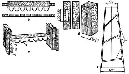 а - креслення канелюр; б - шаблон, що гойдається; в - способи установки шаблону; 1 - профільні дошки; 2 - полозки; 3 - полоз; 4 - правило; 5 - малка
