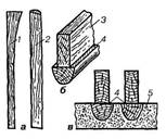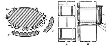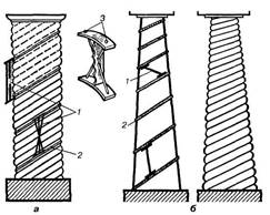 Доплечей також притискують напівтерку для затирання(натирання) ремінців між канелюрами (рис. 6.1,б). Для колон з ентазисом лицьові частини рейок стружать, а підтримуючі рейки випилюють у вигляді лекала і прибивають до них лицьові частини брусків, щоб вони згиналися по кривій поверхні лекала. Для закріплення рейок краще всього використати кільця (див. рис. 5.6). Рейки перед установленням у кільця змащують мастилом для того, щоб їх легко було виймати з розчину. Після встановлення рейок на них наносять шар розчину завтовшки не менш ніж 5 мм, без пропусків (рис. 6.1, в). Як тільки цей шар розчину затужавіє, на нього наносять шар ґрунту, заповнюючи ним весь простір між рейками і колоною. Зайвий розчин, що виступає вище плечей рейок, знімають дерев'яним правилом і натирають напівтеркою. По мірі тужавіння розчину кінці рейок звільняють від кріплення в кільцях, простукують по рейках молотком і вдаряють по верху рейки, зсовуючи вниз кожну рейку на 1-2 мм, завдяки чому вона легко виймається. Таким чином виймають рейки з першої захватки і влаштовують їх на другу, третю і т. д.