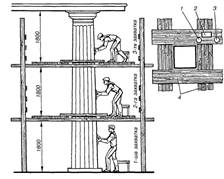 Для провішування, штукатурення та витягування колон влаштовують риштовання. Настил роблять з дощок завтовшки 50 мм, щоб вони не доходили до стовбура колони на 20-40 см. Відстань від однієї площадки до іншої за висотою має бути 1,8 м (висота захватки). Можна використати й інші риштовання.