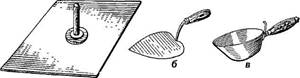 а - алюмінієвий сокіл б - штукатурна лопатка (кельма) в - ківш