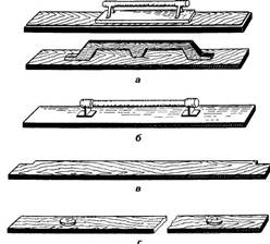 Русторізки і розшивки застосовують для прорізування рустів у пластичному шарі штукатурки. Найпростішу русторізку подано на рис. 2.9, а. Вона складається з дерев'яного бруска, на одному з кінців якого закріплено вигнуту металеву пластинку. Для виконання увігнутих рустів використовують розшивку (рис. 2.9, б), яку під час роботи пересувають вздовж металевої лінійки з прорізом посередині (рис. 2.9, г). Довжина лінійки 1 м.
