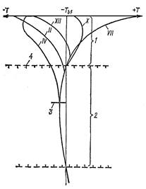 Поэтому в результате развития вертикальных сил пучения, превышающих вес столба и силы бокового трения, грунт увлекает за собой столб вверх и вырывает его из нижележащих слоев грунта. При этом под столбом образуется полость, которая заполняется водой или разжиженным грунтом (II на рис. 44). При полном промерзании сезонноталого слоя в полости замерзает лед (или ледогрунт) (III). В процессе весеннего оттаивания грунта, пока оно не дойдет до подошвы столба, последний сохраняет наиболее высокое положение, достигнутое при выпучивании (IV). После оттаивания льда в полости происходит частичная осадка столба. Однако в. годовом цикле столб оказывается выпученным на какую-то высоту Ah (V на рис. 44). При ежегодном повторении такого процесса столб настолько выпучивается вверх, что теряет устойчивость и падает (VI). При заглублении столба в мерзлую толщу ниже сезониоталого-слоя его выпучиванию дополнительно противодействуют силы смерзания с многолетнемерзлой породой. Если эти силы и вес столба больше, сил пучения, то столб не выпучивается; если меньше — он «выдергивается» из мерзлой толщи.