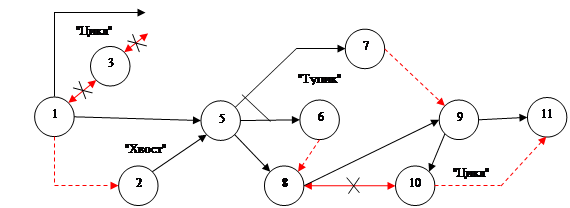 В сетевом графике моделирующим поточное строительство объекта не должно быть ''прострелом'', т.е. не правильной взаимозависимости работ, при построении модели лишь с учетом зависимости между работами смежных потоков, проверкой устанавливается недостающие зависимости и события.
