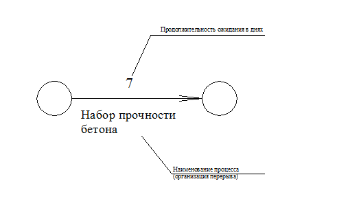 Понятие работы используется в широком смысле и включает в себя кроме охарактеризованной действительной работы следующие значения: ожидания - процесс, выполнение которого требует затрат времени, но не требует затрат ресурсов. К этим процессам относят технологические или организационные перерывы между работой, например, процесс твердения бетона. Обозначается сплошной линией с указанием содержания ожидания и его продолжительности.