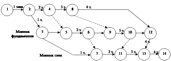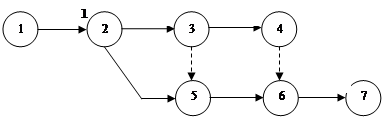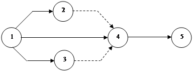 - работа, не требующая затрат ни времени, ни ресурсов и вводится для отражения правильной взаимосвязи между рабочими. В сетевом графике зависимость обозначается пунктирной линией.