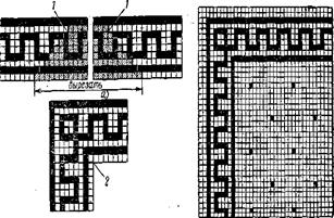 Рис.2.2. Образование угла фриза {б) из фризовых карт (а) и образец пола из карт ковровой мозаики (в): 1 - линия разреза, 2 - линия соединения карт.