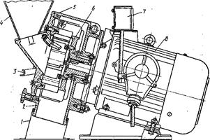 Рис.2.3. Мелотерка СО-53А: 1 - ротор, 2 - статор, 3 - крышка, 4 - воронка, 5-скребок, 6 - корпус, 7 - электродвигатель, 8 - плита