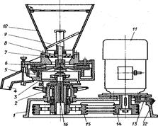 Рис.2.5. Жерновые краскотерки СО-11ОА и СО-116А: 1 - основание, 2 - штурвал, 3 - чаща, 4 - лоток, 5 - корпус, 6 - жернов, 7 - сито, 8 - нож, 9 - питатель, 10 - воронка, 11 - электродвигатель, 12 - шпилька, 13 - плита, 14 - ведущий шкив, 15 - ведомый шкив, 16 - вал