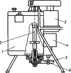 Рис.2.7. Мешалка СО-140: 1 - рама с бункером, 2 - вал с турбиной, 3 - электродвигатель, 4 - защитно-отключающее устройство, 5 - рукав для выгрузки, 6 - разгрузочное устройство