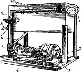 Рис.2.8. Акустическая установка для приготовления водомасляной эмульсии: / - манометр, 2 - стойки, 3 - электродвигатель, 4 - опорная рама, 5 - насос, 6 - патрубок всасывания, 7 - напорный трубопровод, 8 - кран для слива готовой эмульсии, 9 - резервуар, 10 - три патрубка (ответвления напорного трубопровода)