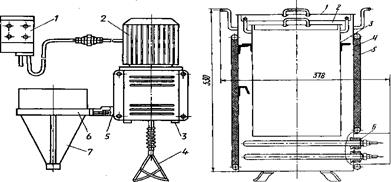 Электроклееварка С-409 (рис.11). В бак 4 вставляется сменный бак 3 вместимостью 16 л (ведро) для клея. В нижней части 0ака помещены электронагревательные элементы ЭТ-80 мощностью 3,6 кВт. Между баками заливают воду, включают электронагревательные элементы 6 и нагревают воду до 100 °С. Нагретая вода предохраняет клей при варке от пригорания. Сливают воду из бака через кран в нижней части. Время приготовления клея 1,5...2 ч.