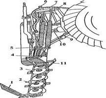 Тяговая штанга одним концом соединена шарнирно со штырем рамы. на другой конец штанги надет корпус главного шарнира, закрепленный болтом при помощи рифленой шайбы и сектора. Сектор боковыми выступами закреплен на кронштейне, а шайба своим рифами входит в рифы сектора. В кронштейне и секторе сделаны продолговатые отверстия. Такое соединение позволяет наклонять режущий аппарат.