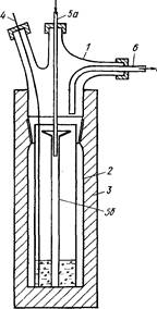 Гомогенный раствор, в состав которого входит родиевый комплекс, и высококипящие остатки от дистилляции, нагревают в реакторе, через который непрерывно проходит поток газа. На схеме применены следующие обозначения: 1 — верхняя часть стеклянного реактора; 2 —- нижняя часть стеклянного реактора; 3 — нагреватель; 4 — термопара; 5а — металлический капилляр со стеклянной входной трубкой; 56 — стеклянный капилляр; 6 — трубка для выхода продуктов. Все компоненты кубового остатка и продукты, образующиеся в результате пиролиза, выносятся из реактора током газа, а получающийся металл остается в реакционной камере.