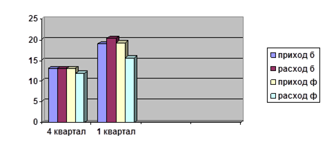 Как видно из таблицы 4 и диаграммы в 4 квартале выполнение бюджета можно считать удовлетворительным, хотя как видно из приложения 5 плановая политика предприятия на данный квартал не была до конца верной, например на приобретение объектов основных средств бюджетом было выделено 8,70936 млн.руб., а израсходовано всего 0,587814182 млн.руб.