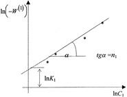 опытные точки для разных моментов времени, в случае справедливости уравнения (28) должны расположиться на прямой линии (рисунок 6). Отрезок на оси ординат дает значение ln