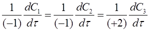 -1,2 - стехиометрические коэффициенты перед веществами реакции с учетом правила знаков (для исходных веществ стехиометрические коэффициенты принимаются отрицательными). С учетом уравнения (2) соотношение (4) примет вид: