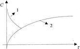 1 - кинетическая кривая исходных веществ; 2 - кинетическая кривая продуктов реакции