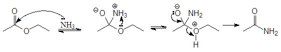 Напишите реакции этиловых эфиров кислот: (а) уксусной, (б) пропионовой, (в) масляной и (г) бензойной с аммиаком и опишите их механизм.