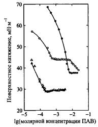 затем наблюдается плато, после которого происходит дальнейшее уменьшение поверхностного натяжения до значений, близких для растворов индивидуального ПАВ. В случае неионогенных ПАВ желатин не влияет на ход изотермы поверхностного натяжения. Однако для глобулярных белков изменение хода изотерм поверхностного натяжения четко свидетельствует о взаимодействии между белком и НПАВ.