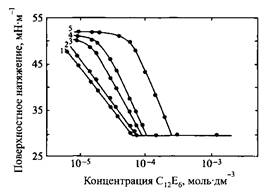 Зависимость поверхностного натяжения от концентрации ПАВ изменяется при введении белка подобно тому, как это происходит при введении в растворы ПАВ слабополярных гомополимеров. Так, представленная на рис. 1 зависимость поверхностного натяжения растворов додецилсульфата натрия в присутствии желатина. На зависимости поверхностного натяжения от концентрации ПАВ появляется излом задолго до KKM5