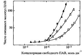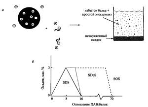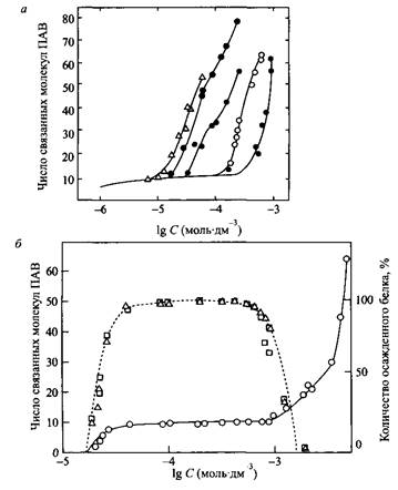 При введении в раствор лизоцима небольших добавок ДСН образуется нейтральный комплекс в виде твердого вещества, находящийся в равновесии с избытком белка в растворе. Количество осажденного белка достигает максимального значения, когда связывание ДСН лизоцимом становится равным 8 молекулам ДСН на одну молекулу белка, т.е. точно равным числу положительных зарядов в молекуле лизоцима. При значительном избытке ПАВ осадок растворяется. Чем короче алкильные цепи ПАВ, тем больше должна быть его концентрация для растворения осадка. Растворение осадка отвечает кооперативной части изотермы связывания в условиях, когда концентрация свободного ПАВ достигает KKM.