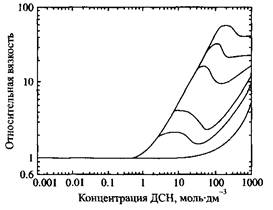 Рис. 6. Относительная вязкость растворов желатина в зависимости от концентрации добавленного додецилсульфата натрия; концентрация желатина: 0, 2.0, 3.0, 5.0, 7.0 и 100 мас.%