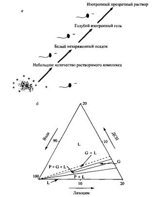 Рис. 9. а — Последовательность изменений свойств образцов при добавлении додецилсульфата натрия в раствор лизоцима.. б — Фазовая диаграмма, схематически показаны области существования раствора, геля и осадка, а также двух- и трехфазные области