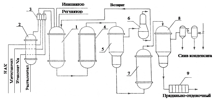 Технологический процесс получения прядильного раствора ПАН включает следующие основные стадии: