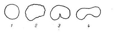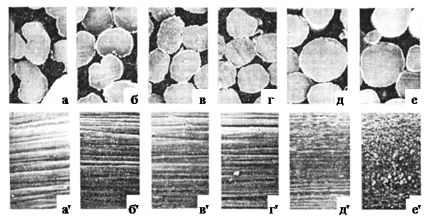 Форма поперечного среза ПАН волокон, сформованных из растворов полимера в различных растворителях зависит от возникновения внутри образующегося студнеобразного волокна давления или разрежения. С другой стороны, форма поперечного среза волокна зависит от жесткости его внешней оболочки (рис.10). При формовании волокна из диметилформамидного раствора ПАН в осадительной ванне образуется волокно круглого сечения с большим количеством крупных пор. При увеличении содержания ДМФА в осадительной ванне поперечный срез принимает вид фасоли, а при содержании ДМФА 80% образуется волокно овального сечения.