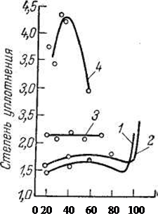Так как на степень ориентации элементов структуры оказывают влияние время пребывания раствора в капилляре, значение градиента скоростей течения и свойства растворенного полимера, такое же влияние эти параметры оказывают и на степень максимального расширения струйки раствора на выходе из фильеры. С увеличением времени пребывания раствора в капилляре, выраженного в пропорциональных ему величинах l : d, степень максимального расширения струйки сначала увеличивается, а затем уменьшается до некоторого предела.
