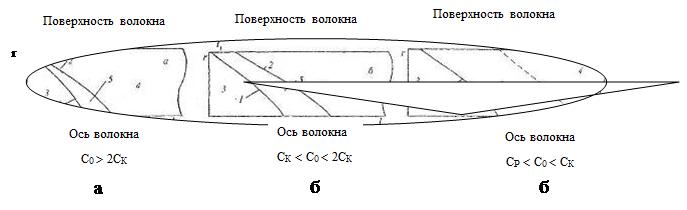 Области протекания коагуляции по тому или другому механизму иллюстрируются на рис.14, где схематично дается продольное сечение волокна, формующегося в осадительные ванны разной коагулирующей способности: жесткие, мягкие и сверхмягкие.