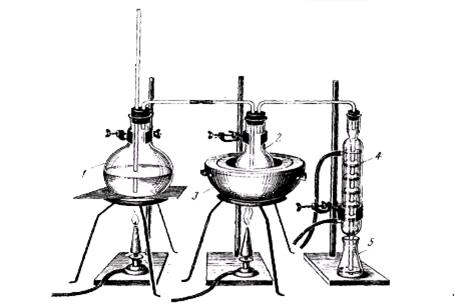 1 – парообразователь; 2 – колба с объектом исследования; 3 – баня водяная; 4 – холодильник шариковый; 5 – приемник дистиллята.
