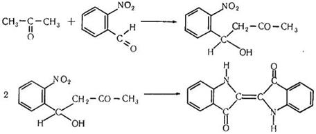 4. Реакция с о – нитробензальдегидом. При взаимодействии ацетона с о-нитробензальдегидом в щелочной среде образуется индиго, имеющее синюю окраску: